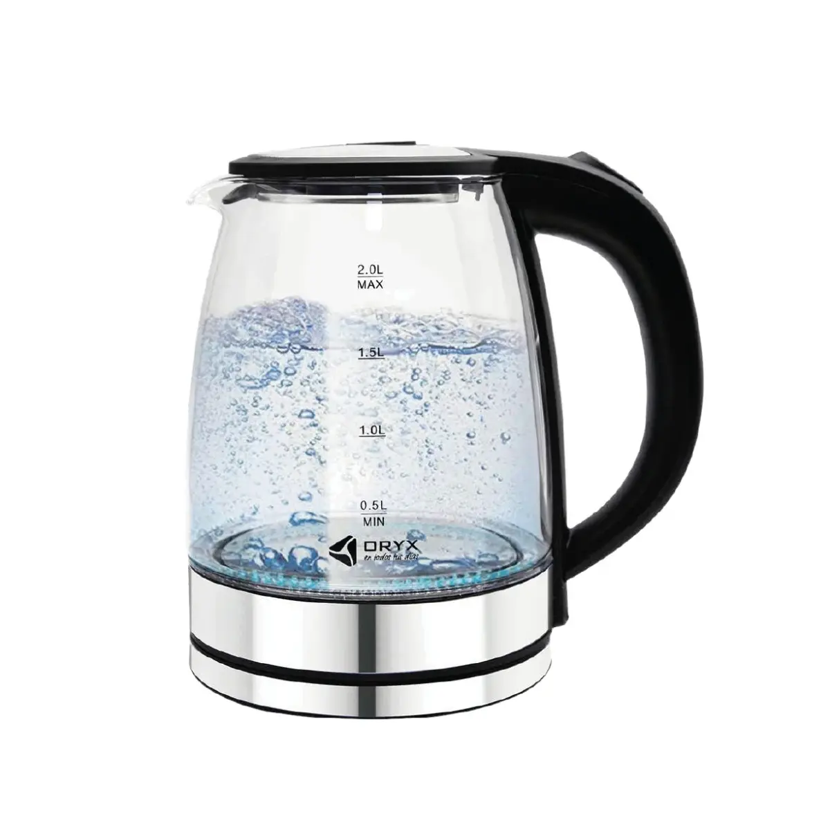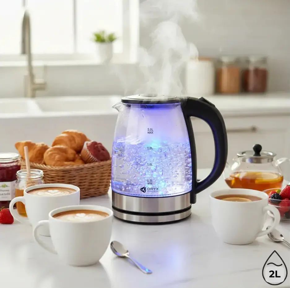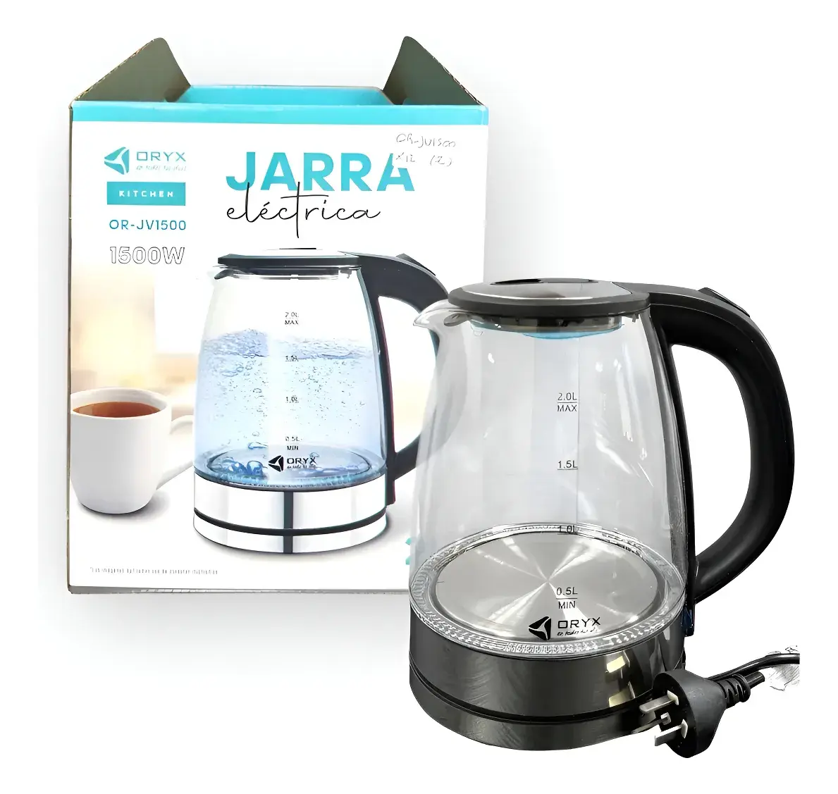 Pava eléctrica de vidrio ORYX de 2 litros con calentamiento rápido de 1500W. Cuenta con iluminación LED, base giratoria 360° y diseño moderno que permite ver el proceso de ebullición. Ideal para preparar mate, té o café de forma práctica y rápida.