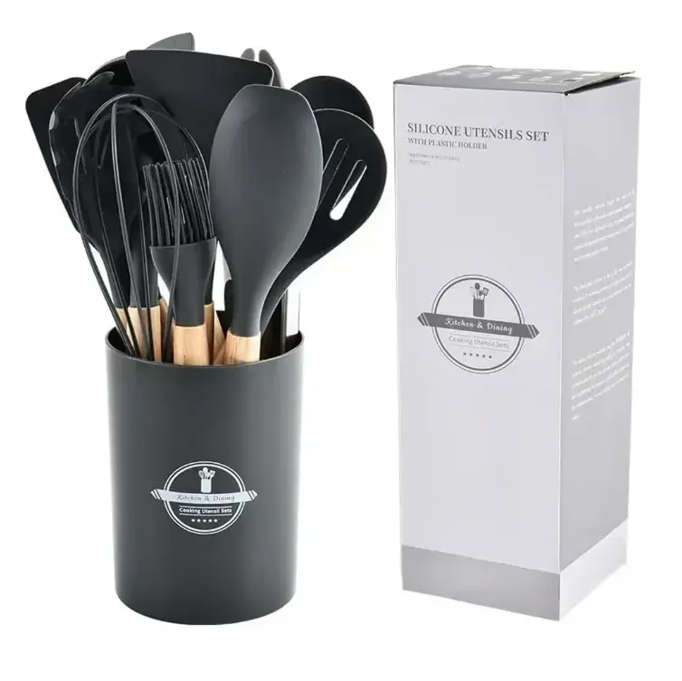 Juego de utensilios de cocina x12 de silicona con mangos de madera, resistentes al calor y seguros para todo tipo de ollas y sartenes. Incluye soporte organizador para mantener tu cocina ordenada. Prácticos, duraderos y fáciles de limpiar.